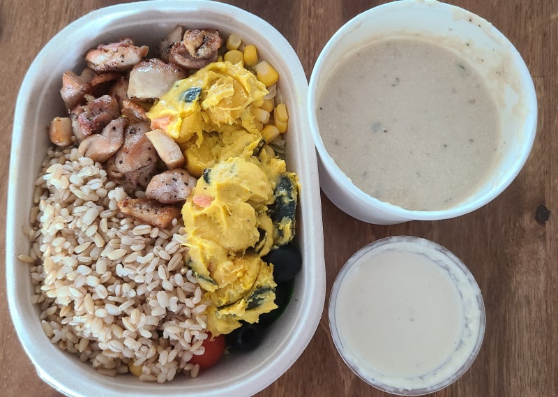 드디어 하이라이트인 매콤 치즈 가지 솥밥이 등장했습니다. 먹음직스럽게 구성되어 있어서 군침이 돌더군요. 가지는 살이 촘촘하고 신선했습니다.